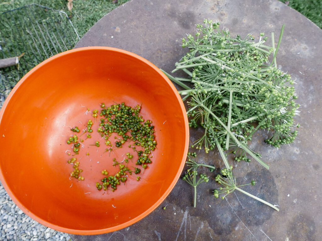 Für die Ernte hat sich folgendes Vorgehen bewährt: Die doldigen Blütenstände mit den Samenkapseln werden samt Stiel gesammelt. Danach werden mit Daumen und Zeigefinger die Blütenstiele verquirlt und im dann die Samenkapsel am Ansatz der Blütenstile abgetrennt.