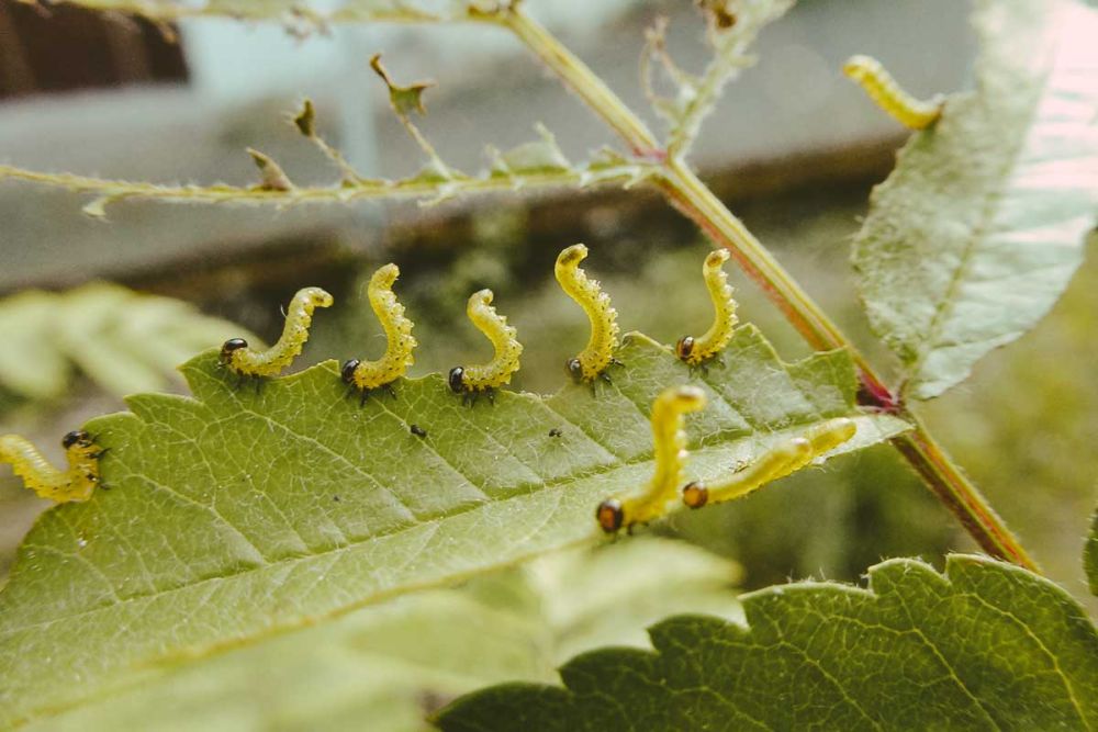 Titelbild: Larven von Pflanzenwespen in gemeinsamer Abwehrhaltung, Bild: Peter Jann