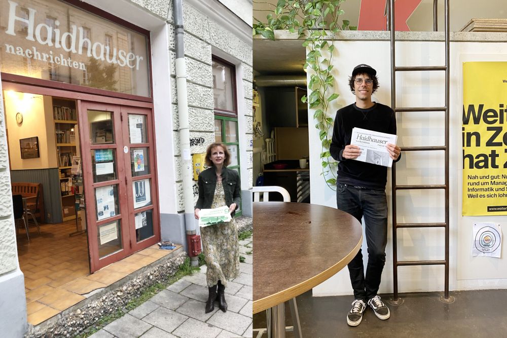 Bild: Karin Unkrig vor der Redaktion der Haidhauser Nachrichten an der Breisacher Strasse 12 in München, und Andreas Ott, Gestalter des Gönhard-Gezwitschers mit einer Nummer der Haidhauser Nachrichten in seinem Atelier in Aarau.