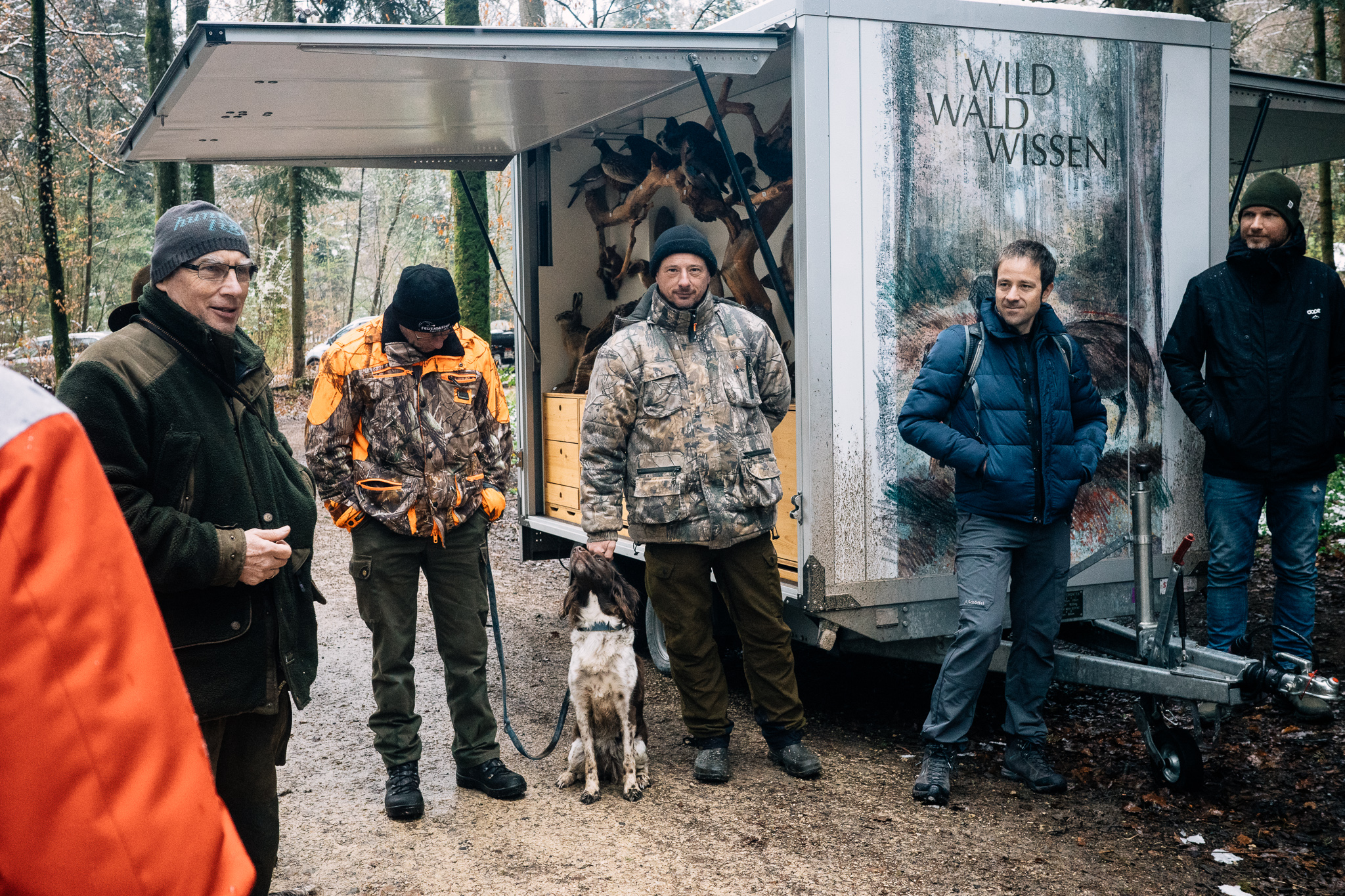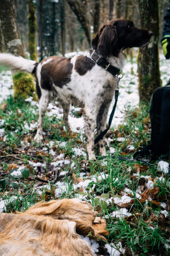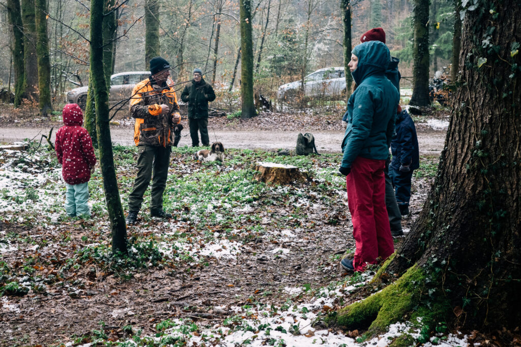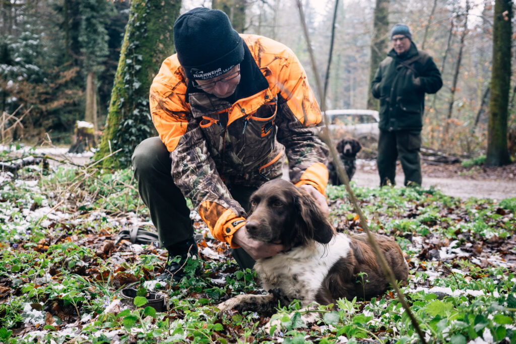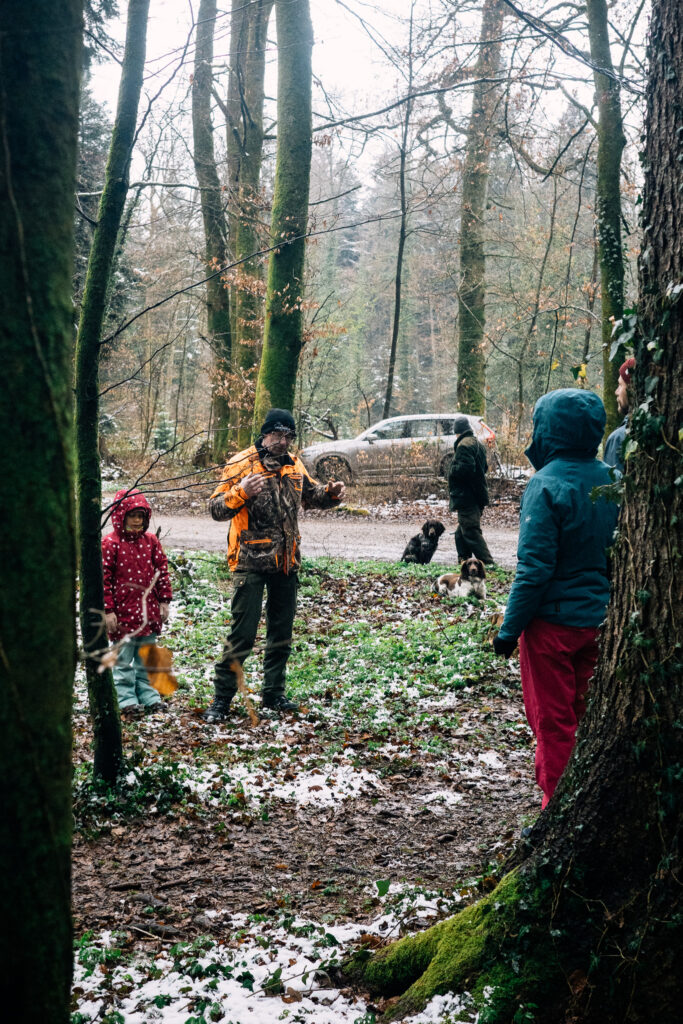 «Es gibt kein schlechtes Wetter, es gibt nur schlechte Kleidung!» mit diesen Worten begrüsste bei fast winterlichem Schneetreiben Daniel Rebsamen, Präsident der Jagdgesellschaft Unterentfelden und seine drei KollegInnen die 20-köpfige Teilnehmerschar. Mit dabei auch Aischa und Leika, die beiden Jagdhunde und Hauptakteure bei der «Schweissspursuche».