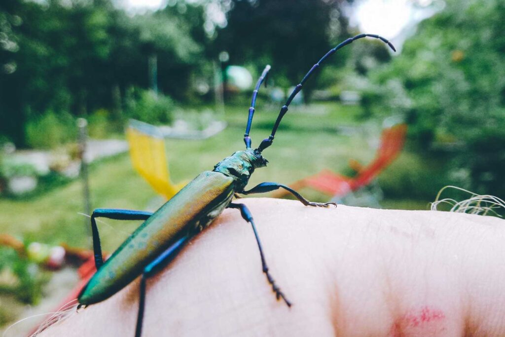 Gärten sind auch Wohnung und Unterschlupf für viele kleine Krabbeltiere. Mein persönlicher Favorit: der grün bläulich schimmernde Moschusbock. Ein Käfer, der über drei Zentimeter gross werden kann.