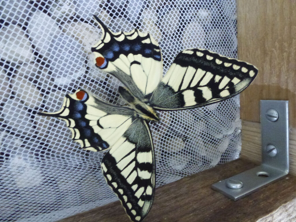 Diesen Sommer habe ich Wespen beobachtet, die die auffällig gefärbten Raupen als Frischfleisch abtransportierten. Daraufhin habe ich beschlossen, endlich ein lang hinausgeschobenes Kindheitsprojekt zu realisieren und die restlichen Raupen unter meinem Schutz aufzuziehen. Zunächst in der Küche, dann in einem selbst gebastelten Schmetterlingskasten. Ende August haben sich die Raupen verpuppt und am 18. September 2021 ist daraus ein wunderschöner Schmetterling geschlüpft.